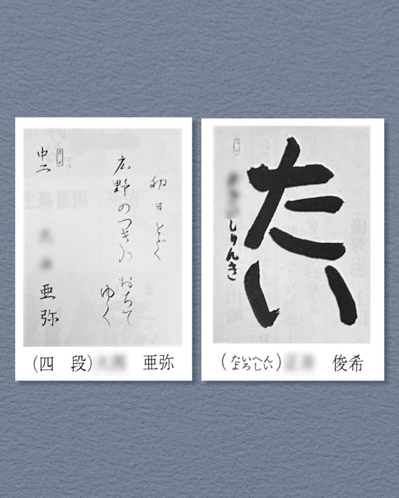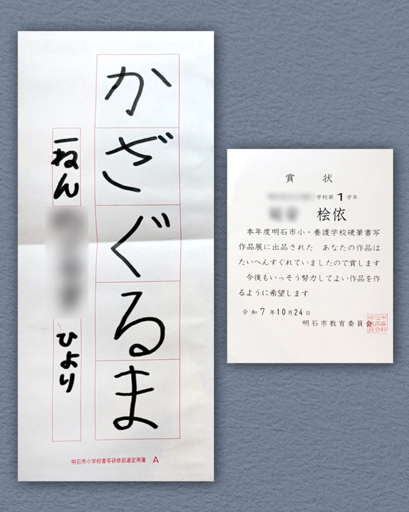 通い始めてもうすぐ一年になります。息子は年中からのスタートで、はじめは行き渋る日もありましたが、子どもの気持ちに寄り添ってくださる先生のもと、無理なく通い続けることができています。娘は教室に行く日を楽しみにして、毎回「今日は◯◯を書いた」「難しかったけど最後に上手く書けた」と嬉しそうに話してくれます。硬筆も毛筆も評価してもらえる事が増え、とても自信がついたようです。だんだん昇級していくことも喜び「もっと上手く書きたい」と意欲的に取り組む姿が見られ、嬉しく思っています。今後も花風書道教室に通って、子どもたちの成長を楽しみにしています。